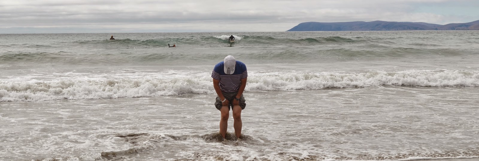 可是还是躲不了,Santa Barbara沙滩不容错过。一行四人到了沙滩,真大,从停车场到海边要走5分钟,光脚踏在沙子里走不快,倒是蛮舒服的。大领又欢呼雀跃:“来了还不下水!”,在沙滩上消磨半日时光,蓝马重蹈覆辙,上演每次墨西哥海边照伤的故事:蓝马每次趴在阳光下,不感觉到太阳的厉害,洒在身上挺暖洋洋,就忘了涂防晒霜了,结果可想而知,后来一个月里烫热脱皮。