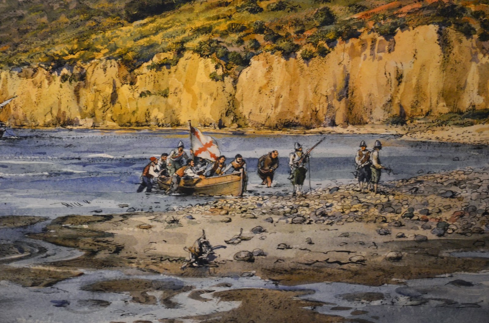 访问中心里蓝马颇有兴趣看了历史资料,想象着当年Cabrillo作为首个登陆北美的海盗探险家的模样,天朝是不是有人更早踏上北美?印第安人到底是不是中国人的演变?!Cabrillo,全名Juan Rodríguez Cabrillo,于1543和Tongva部落激战受伤后感染坏疽(gangrene)而死,那块石头传说是他的墓碑。蓝马不由地感慨,人生即将飘逝,如何青史留名,乃吾等所追求也!