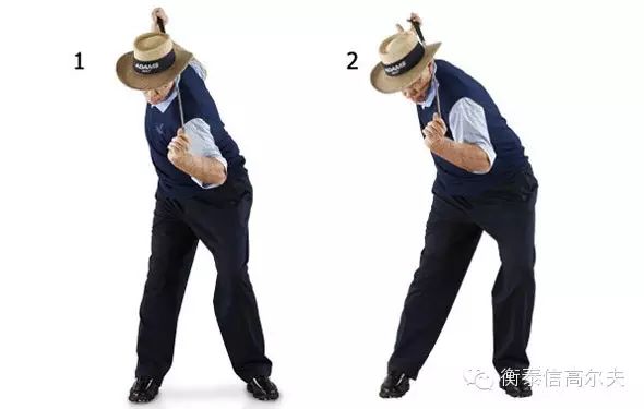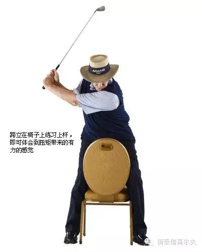 如图所示,拿一把椅子,跨立在椅子上,摆出站位动作。(要想达到最佳效果,应选择一把与站位宽度相同的椅子,你应该感觉到椅子对大腿内侧施加了压力。)缓慢转肩,直至最大限度。椅子自然能够避免髋部转动,使得你能够像马克等职业球员一样感觉到上杆的扭矩。回到站位动作,重复。每天练习10次转体,坚持两三周,你就能够感觉到挥杆力量大有进步。
