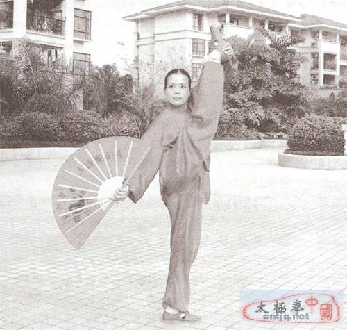 现以金鸡独立与右分脚为例,谈谈以上方法要领在完成拳式中的具体体现。