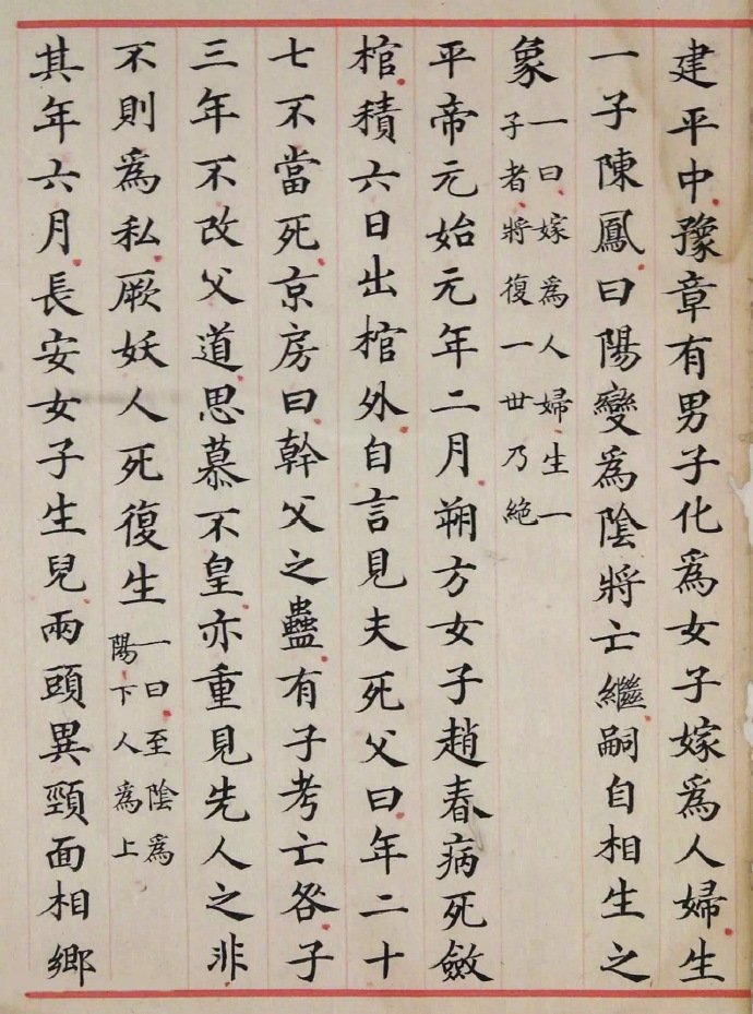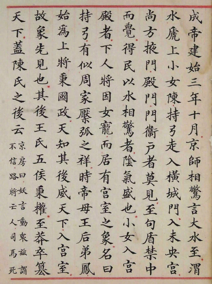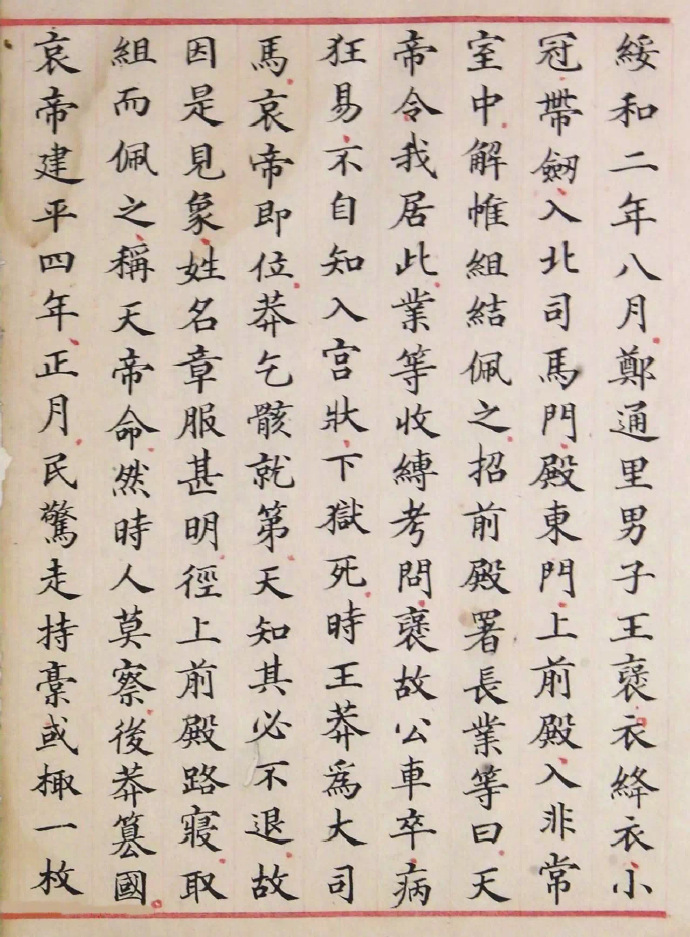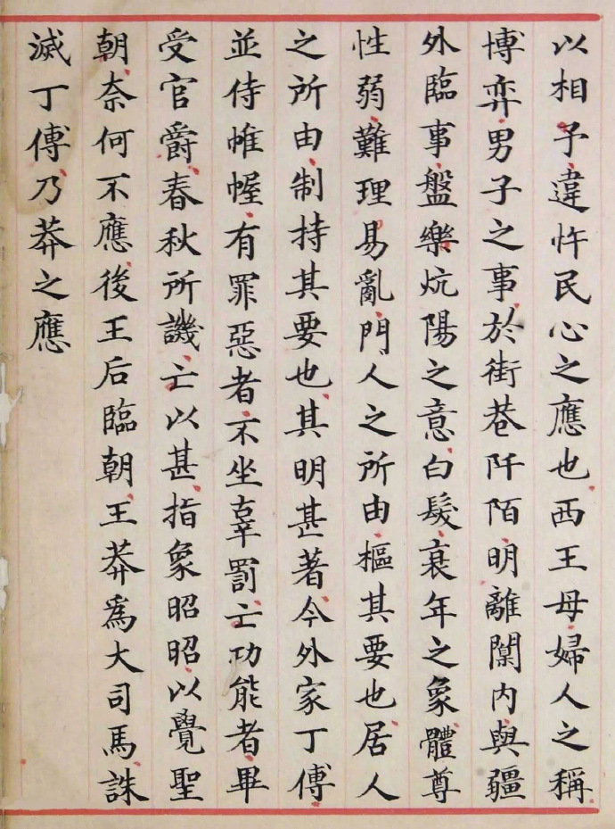 《洪范政鉴》,朱丝栏左右细线,无边栏,半页9行,每行17字。书中避宋讳至「慎」等字均缺笔,唯「敦」字不缺笔,是为孝宗时重新缮写之旁证。现选刊洪范政鉴序及第十二卷下,让书友目睹这珍贵的宋人楷书墨迹。