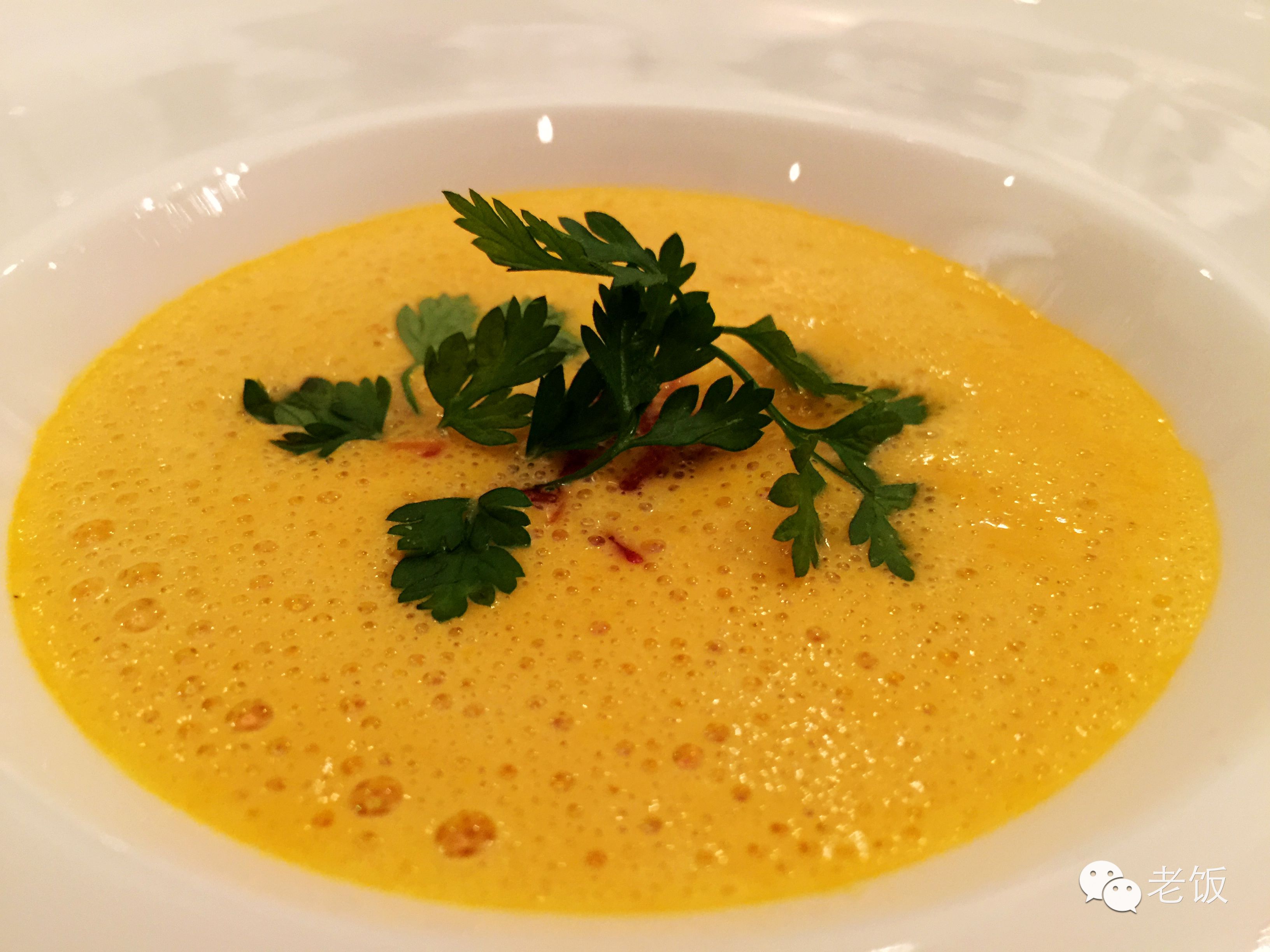 当日菜品共六道,最为之惊艳的是首道南瓜汤。相比一般的南瓜浓汤,奶香更浓郁,但大厨却说并没有加任何奶油,南瓜也并非特殊品种。这道汤与众不同的关键在于大厨用咸黄油烤制南瓜,黄油的乳脂含量约80%,而奶油的脂含量不会超过50%,用黄油代替奶油,风味自然更足。西班牙火腿碎是此道汤品的点睛之笔,味觉上解腻,视觉上升华了单一的颜色。
