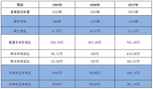 下表:2017、2008、1998年高等教育部分统计数据(数据来自于教育部年度统计公报):