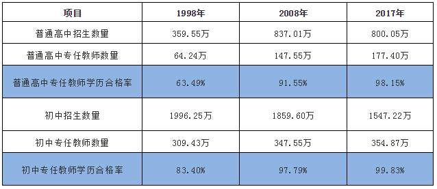 以高中为例,专任教师合格率(本科及以上)从1998年的63.49%,提升到2008年的91.55%,2017年达到98.15%。从“学历”上来看,普通高中教师的“素质”是明显提升了。