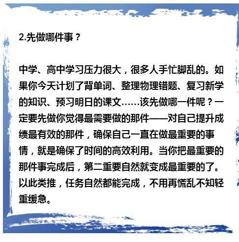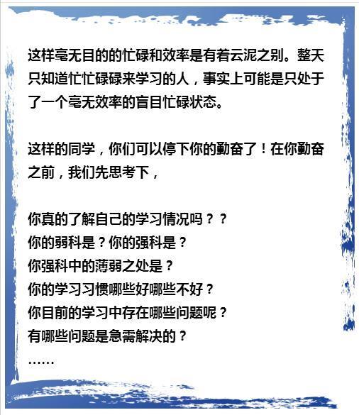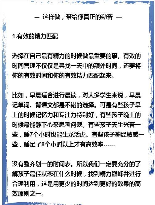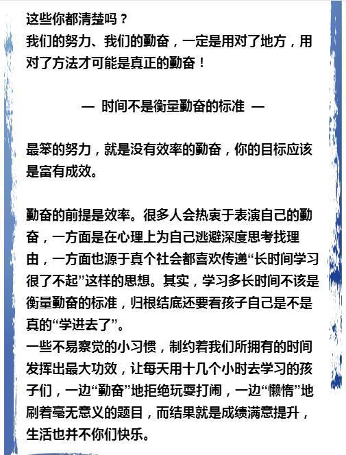 这位学生当时情绪比较激动,我先安慰了她,然后慢慢给她分析。你分秒必争,坚持把白天到晚上的每段时间都安排的很紧凑,甚至大半夜还在熬夜刷题!但是,这样做长久下去的结果是,学习的时间是越来越长,休息时间越来越短,你的学习效率越来越低下……你的情绪越来越焦躁,你开始害怕,害怕你的作业总是写不完,害怕你的努力没有成正比的成绩!