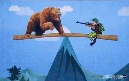 表面看起来,董卿说的只是这张图,猎人拿着枪占据优势,可是如果他开枪打死熊,那自己也就会掉下去,掉下去的结果非死即伤。也就是说,枪响的结果就是两败俱伤。