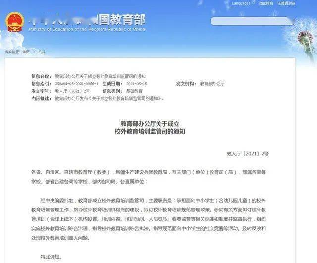 6月15日,国家教育部宣布:经中央批准,教育部正式成立校外教育培训监管司。