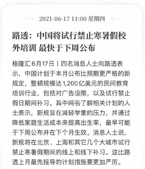 6月17日,路透社报道,中国将试行禁止寒暑假校外培训,最快从今年暑假开始。