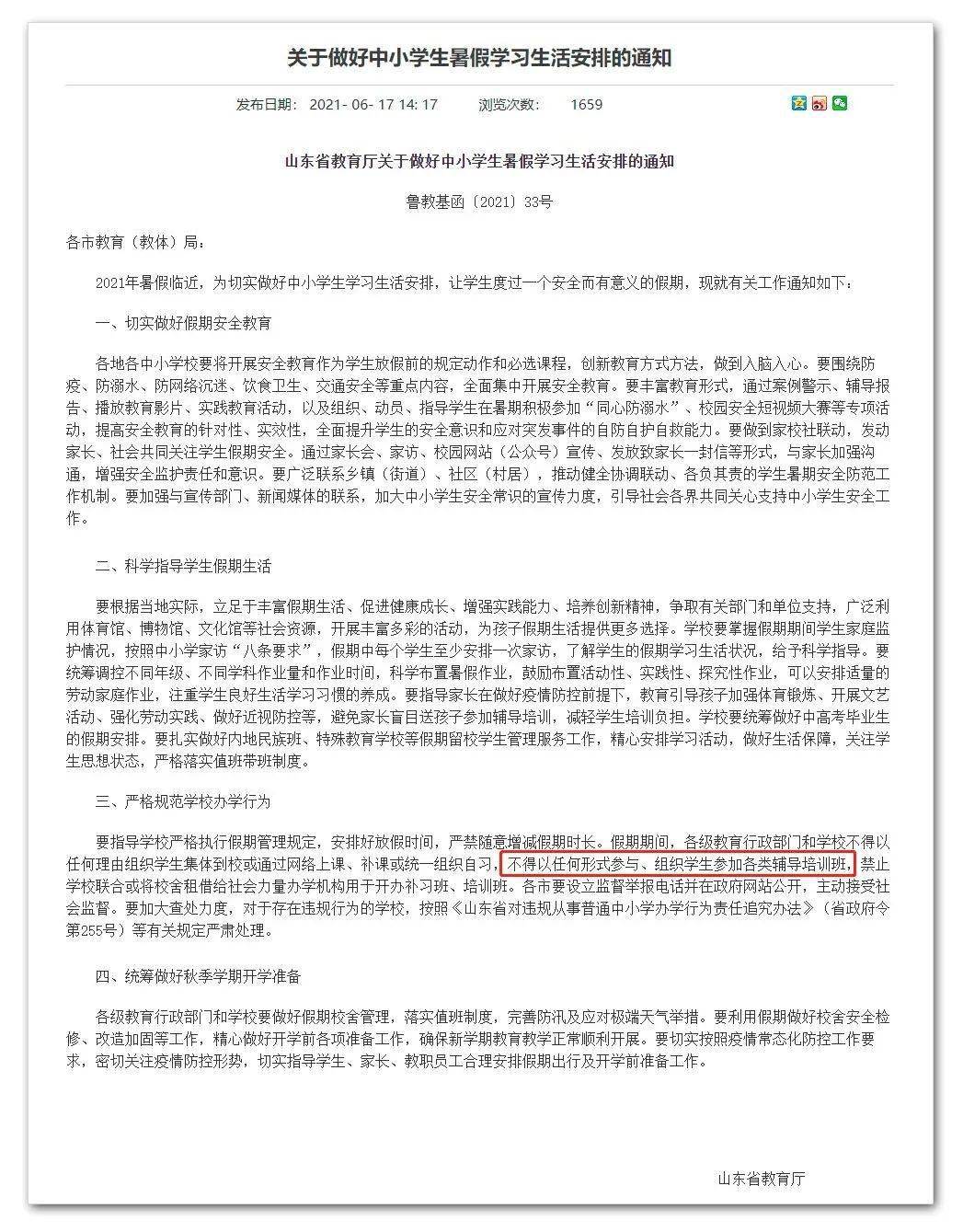 当天下午,山东省教育厅印发《关于做好中小学生暑假学习生活安排的通知》,明文禁止:各类机构不得以任何形式参与、组织学生参加辅导培训班,禁止学校联合或将校舍租借给社会机构用于开办补习班、培训班。