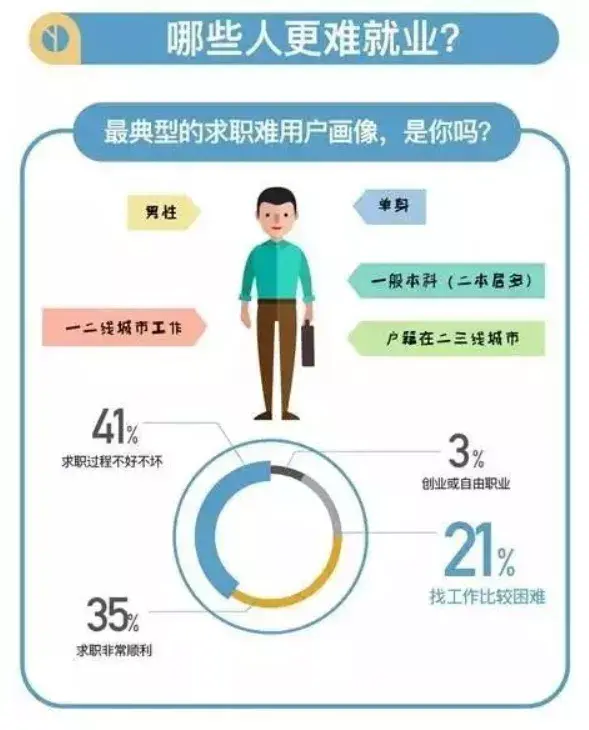 在根据2017年《中国大学生就业难人群画像报告》显示,最典型的求职难用户画像是在二本毕业、户籍地在三四线城市、在一二线城市求职的单身男性,足足有21%的人找工作非常困难。
