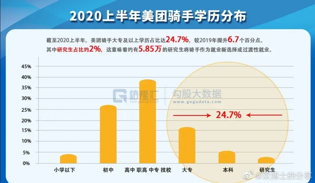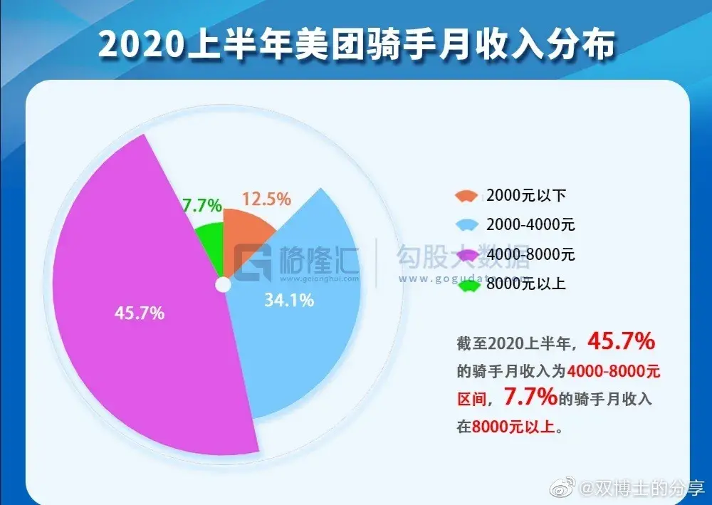 2020年上半年美团骑手大专及以上学历占比达24.7%,但45.7%的骑手月收入在4-8K之间,仅有7.7%的骑手月收入在8k以上