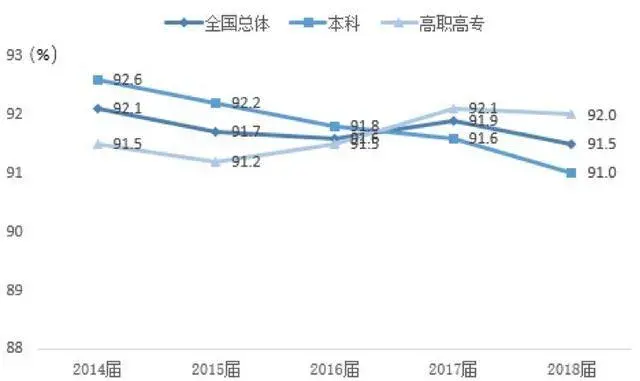 根据《2019年中国大学生就业报告》显示,2018届本科毕业生就业率为91.0%,“受雇工作”的比例为73.6%,并且均在持续下降。读研的比例为16.8%,在家待业或准备考研比例达到了7.5%。