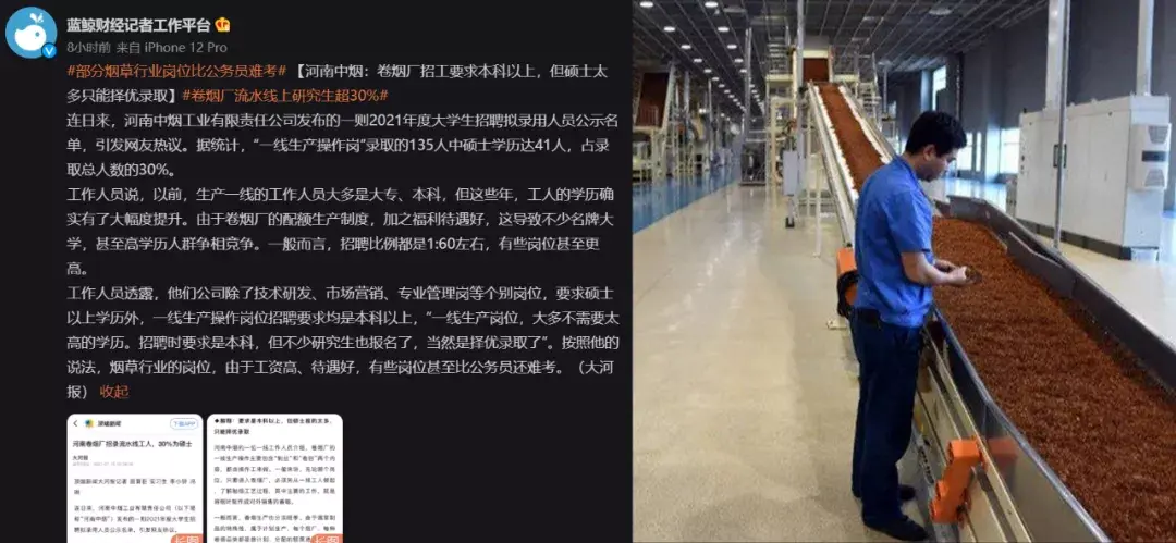 连日来,河南中烟工业有限责任公司发布的一则2021年度大学生招聘拟录用人员公示名单,引发网友热议。据统计,“一线生产操作岗”录取的135人中硕士学历达41人,占录取总人数的30%。由于卷烟厂的配额生产制度,加之福利待遇好,这导致不少名牌大学,甚至高学历人群争相竞争,有些岗位甚至比公务员还难考。