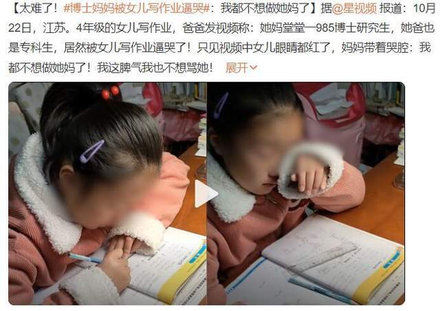 近日晚上一妈妈教孩子做作业痛哭的视频上了热搜,据报道,该妈妈是985博士,父亲专科毕业,视频中孩子好像很认真地做作业,妈妈切斯底里的哭道再也不想做妈妈了!