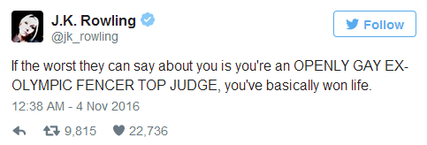 如果他们对你最恶劣的评价是:一个前奥运击剑选手、同性恋(其中一名大法官),那说明你基本上无生命危险了。(暗指《每日邮报》有鼓吹脱欧人士暗杀大法官之嫌)