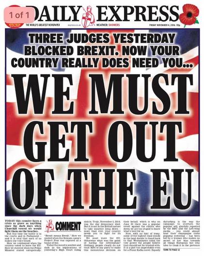 《每日快讯》则耸人听闻地说到:三名大法官切断了英国脱欧之路,现在你的国家需要你。因为: