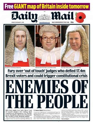 这些报纸头版宣泄情绪的做法,尤其是《每日邮报》登出三名大法官肖像并称他们为“人民公敌”,在英国引起了极大的争议。
