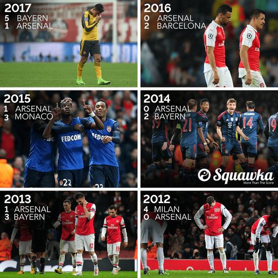 阿森纳的欧冠悲情命运还在延续,被拜仁5球血洗后,本赛季枪手的欧冠之旅已经宣告结束。即便两队次回合的比赛未进行,但面对如此悬殊的分差,恐怕就连阿森纳的球员们都已无心恋战。不过相比起淘汰出局的结果,枪手连续7个赛季止步于欧冠16强,更加让温格和他的弟子们感到崩溃。对于阿森纳来说,欧冠16强似乎成为球队永远迈不过的坎。只要一到欧冠淘汰赛阶段,枪手注定成为背景帝。