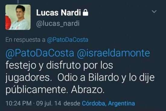 人们挖出纳尔迪在2014年与其他球迷在推特上的对话,其中写道:“比拉尔多实在讨厌,我就把话放这儿了