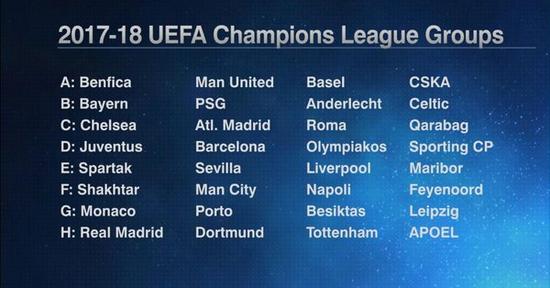 随着新赛季欧冠小组赛抽签结果正式揭晓,众豪门是有的欢喜有的愁。卫冕冠军皇马虽然与实力不俗的多特、热刺分在一组,但银河战舰依旧是傲视群雄,出线是没有任何的问题。巴萨与尤文再度聚首,巴黎与拜仁的死磕,也都充满着看点。从小组赛抽签结果来看,曼联无疑是最幸运的豪门球队,红魔与本菲卡、巴塞尔、莫斯科中央陆军分在A组,以本赛季曼联的实力来看,球队获得小组第一出线问题不大。而切尔西与马竞和罗马分在同一小组,使得B组成为名副其实的死亡之组。