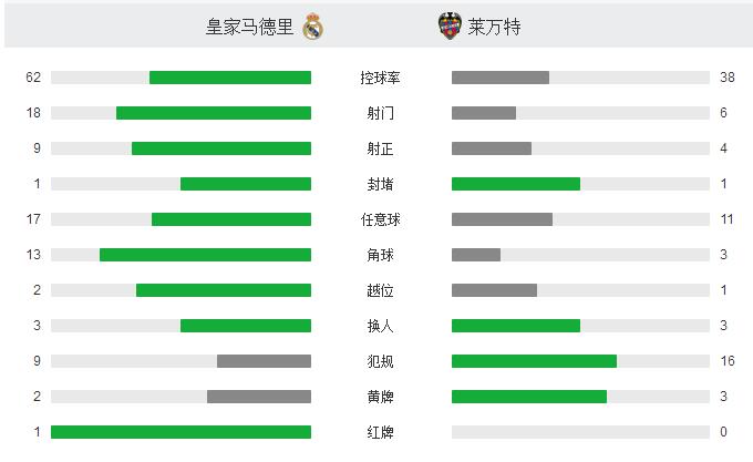 但此役皇马的进攻球员似乎都忘记穿上射门靴,除了巴斯克斯在门前捡漏帮助皇马将比分扳平外,无论是主力中锋本泽马,还是近来大放异彩的阿森西奥,以及替补临危受命的贝尔,都无法在场上为球队带来进球。皇马此役即便是在各项数据上占据着压倒性的优势,但无奈球队整体进攻乏术,只能眼睁睁的看着莱万特从伯纳乌带走一分。