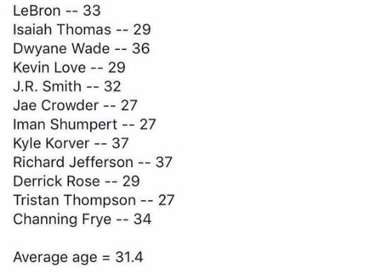 现在这支骑士队,韦德36岁、詹姆斯33岁,罗斯、小托马斯、乐福这三位全明星也即将年满30岁,球队平均年龄居然达到了惊人的31.4岁,骑士毫无疑问成为全联盟当中就有历史感的队伍。大家都知道在竞争如此激烈的联盟当中,球队年纪偏大自然也意味着承受的伤病风险隐患也随着增加。