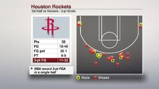 此役火箭队又创造了联盟一项新纪录,那就是半场出手三分球次数。本场比赛,火箭队在上半场就疯狂出手32次三分,打破球队去年与鹈鹕比赛中,半场31次三分出手的记录。