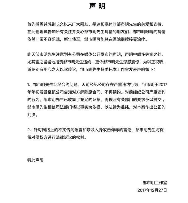 面对眼前各种质疑声和不实言论,邹市明个人工作室在网上发布了官方消息称,此前网络上各种言论均为误导,其经纪公司发表的声明也有诸多失实之处,他们“对此感到震惊”,同时还表示,年初已经发函至该经纪公司解除合同,会走法律途径。