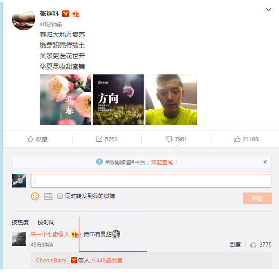 在张继科这首看似是为了迎接立春有感而发的诗中,却有着浓浓的甜蜜。虽然这不是首藏头诗,但是在诗句中明显暗藏了景甜的名字,眼尖的网友一下子就将张继科这个小心思戳破。不得不说,张继科这把狗粮撒的令人猝不及防。