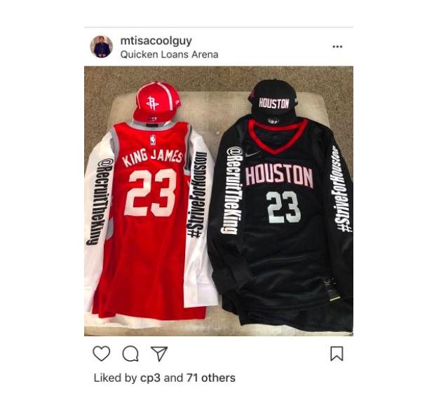 近日,有眼尖的美国网友发现火箭当家后卫保罗,在一社交软件平台上给一张有趣的图片点赞。这张图片的内容是火箭球迷个人定制的两套火箭版勒布朗球衣,分为黑红两色,号码是23号,后背名字则是詹皇的英文“King James”。除了詹姆斯的火箭球衣之外,图片中还有黑白两套卫衣,上面也写着招募詹姆斯的标语。