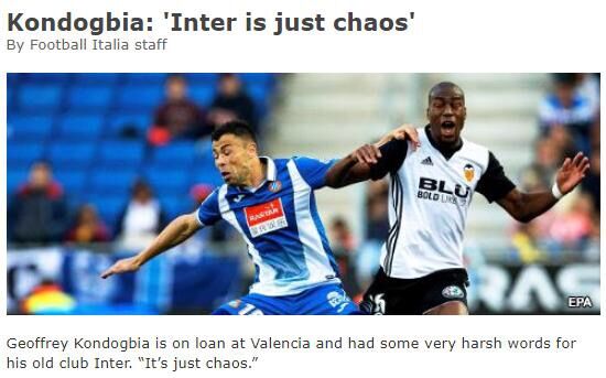 对于国米如今的困境,本赛季被蓝黑军团租借给巴伦西亚的昔日中场大将孔多比亚,则是一针见血的点出国米症结所在。蓝黑军团之所以近几个赛季会出现突然崩盘的局面,就是因为球队内部太不团结。国米的将士们并没有真正形成一个战斗的整体,球队的更衣室相当混乱,球员之间形成小团体,再加上近些年来球队频繁更换主教练,造成蓝黑军团无法有一个稳定的环境,使得球队始终无法重返正轨。