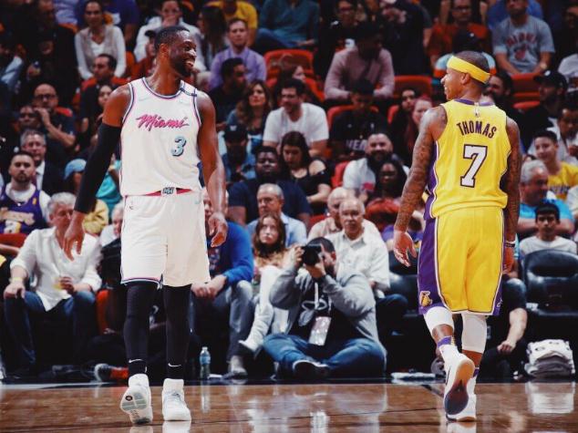 在今日热火与湖人的比赛中,有这样一幕画面被媒体捕捉下来,那就是刚刚被骑士队抛弃的两大“毒瘤”韦德与小托马斯,在本场比赛重逢。当两人都不再穿着骑士战袍,出现在同一块场上,韦德与小托马斯相视一笑。