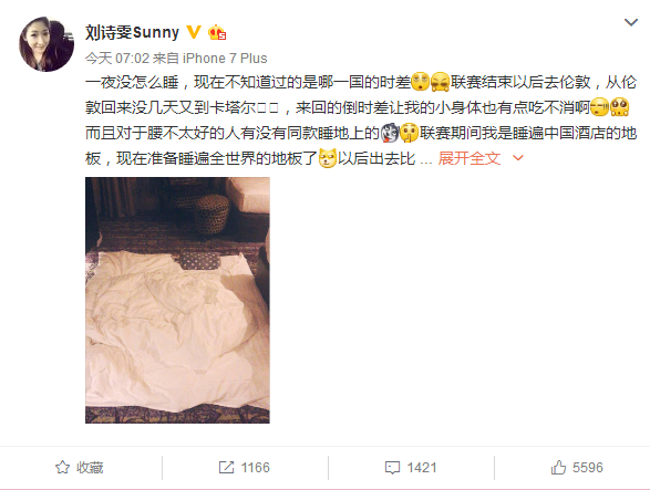 刘诗雯在自己的社交媒体上写道:“一夜没怎么睡,现在不知道过的是哪一国的时差,联赛结束以后去伦敦,从伦敦回来没几天又到卡塔尔,来回的倒时差让我的小身体也有点吃不消啊,而且对于腰不太好的人有没有同款睡地上的,联赛期间我是睡遍中国酒店的地板,现在准备睡遍全世界的地板了,以后出去比赛我觉得可以不用,直接地上留块地方就行。”,小枣对自己的伤病进行调侃。