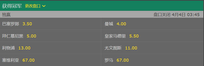 从目前欧洲各大菠菜公司给出的数据来看,就可以知道,巴萨和曼城成为目前夺冠的最大热门。而对于意甲的两支球队来说,尤文和罗马则是相当悲催。本以为时隔10年之久,两支意甲队伍可以重返欧冠8强舞台,能够让意甲球迷更多期待一下。怎奈直接碰到西超双雄巴萨和皇马,让球队的晋级希望破灭。