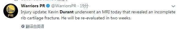 在今日勇士与国王的比赛之前,杜兰特因为肋骨软骨存在不完全骨折,将休战至少2周。2周之后杜兰特还将进一步做评估,已确定他能否继续征战剩下的比赛。算上杜兰特在内,勇士阵中的三巨头库里、汤普森、杜兰特全部因伤高挂免战牌。三巨头同时缺阵这对于勇士的影响是显而易见的,没有三巨头的勇士以残阵迎战国王,最终还是以失败告终。