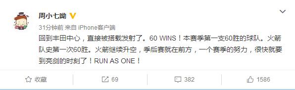 本场比赛也是周琦今年以来第一次代表火箭队出战,大魔王自然是相当兴奋。在赛后周琦也在个人的社交媒体上发表了最新的动态,对火箭队取得60胜表示祝贺!