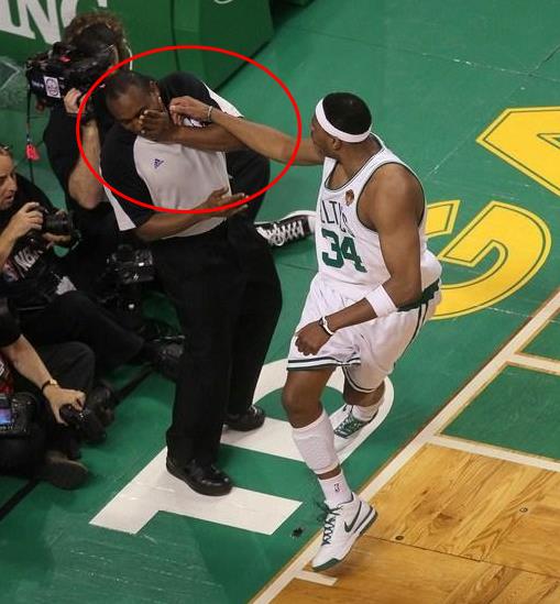 2010年NBA总决赛第四场,当时凯尔特人在主场迎战湖人,在第一节比赛还剩1分06秒时,绿衫军队长皮尔斯突破上篮得手,并且制造对手犯规,得到2+1机会的真理,随即是兴奋挥拳庆祝,但没有想到的是皮尔斯这一激情挥拳,居然打到当时裁判拉什,皮尔斯的挥拳动作,看上去更像是对准裁判的一记勾拳。