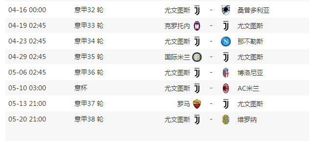 尤文除了需要在欧冠舞台上与实力强大的皇马再度交锋之外,在意大利国内,老妇人还需要经历一场与国际米兰的意大利国家德比大战。而目前蓝黑军团正在为了一张下赛季欧冠门票不懈努力中,所以遇到尤文,国米肯定会死磕到底,老妇人能否在本场比赛中全取三分,也是一个疑问。同样在意甲第37轮中,尤文还需要与罗马上演强强较量,红狼目前也是为了欧冠门票抢积分,遇到尤文肯定也要竭尽全力争胜。至于意大利杯决赛,尤文想要破灭AC米兰本赛季唯一的夺冠希望,难度自然是大大提升。
