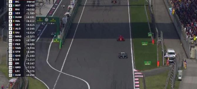 为了守住自己的头名位置,维特尔采取切线发车,但却丝毫没有顾及队友莱科宁的线路,变本加厉切线的德国人,直接是将有望在发车阶段成为第一的莱科宁险些挤出赛道。德国人这一举动不仅阻挡住莱科宁的正常前进路线,也造成芬兰冰人在发车阶段瞬间失去了动力,随机被身后的博塔斯、维斯塔潘的超越,下滑至第四的位置。