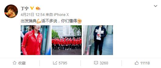 丁宁则是一贯的简短霸气,她在个人社交媒体上写到:“出发瑞典,话不多说,你们懂得”。丁宁简短的语言则是透露出她强大的自信心,对于冠军势在必得。