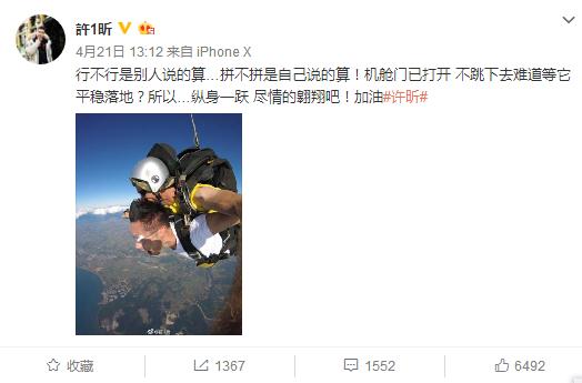 许昕则是晒出了一张自己跳伞的照片,并且配文写道:“行不行是别人说的算…拼不拼是自己说的算!机舱门已打开,不跳下去难道等它平稳落地?所以…纵身一跃 尽情的翱翔吧!加油。”通过许昕的表态来看,他是做好了准备,想要在本届世乒赛中放手一搏,努力拼一把。