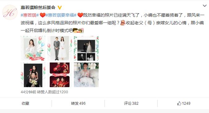 惠若琪官方后援会在社交媒体平台上写道:“既然幸福的照片已经满天飞了,小编也不藏着掖着了,跟风来一波祝福,这么多风格迥异的照片你们最爱哪一组呢?收起老父(母)亲嫁女儿的心情,跟小编一起开启婚礼倒计时模式吧”