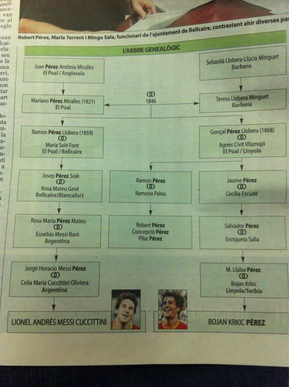 一个阿根廷人,一个西班牙人,两人居然有亲戚关系,这怎么可能。但梅西与博扬的确是失散多年的远房表兄弟。根据西班牙加泰罗尼亚媒体发现,梅西的祖先是来自加泰罗尼亚的,梅西和博扬是远房表亲,他们的高曾祖是兄弟的关系。梅西祖母的家族和博扬母亲的家族中,都有“佩雷斯”这个姓氏,他们都来自加泰罗尼亚一个名叫波尔的村庄,很可能是18世纪从阿拉贡地区的特鲁埃尔移民到这一地区的。