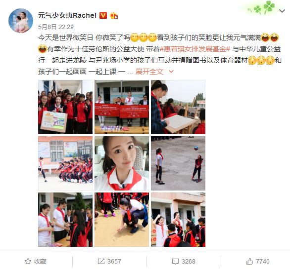 惠若琪通过自己的个人社交媒体平台,发布了此次支教活动心得体会。排球女神写道:“今天是世界微笑日,你微笑了吗?看到孩子们的笑脸更让我元气满满,有幸作为十佳劳伦斯的公益大使,带着#惠若琪女排发展基金#与中华儿童公益行一起走进龙陵,与尹兆场小学的孩子们互动并捐赠图书以及体育器材。和孩子们一起画画、一起上课、一起吃饭、感受到了满满的朝气与能量。今天给孩子们上排球课时候,有一个小男孩一次垫了十五个,感觉很有潜力哦。作为美丽中国的支教地之一,实地走访后,看到年轻的老师们与学生们相亲相爱,也不禁开始期待我们之后的体育支教会给孩子们带来什么样的惊喜。体育可以改变人生,也可以为社会更好的服务,让我们不忘初心,将爱继续播种。”