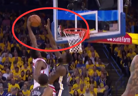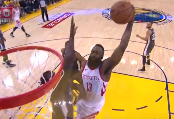 大胡子先是在外线找回手感,不断用三分球带领火箭迫近比分。随后在第二节的一次进攻中,哈登更是上演了残暴隔扣的好戏。第二节比赛进行到6分钟,哈登在进攻中先后过掉鲁尼、库里,面对前来补防的格林,就是一记重扣,完成精彩的2+1.。