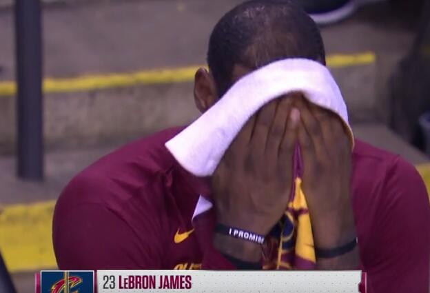 随着分差逐渐被凯尔特人拉大,詹姆斯在场下直接用毛巾捂住自己的双眼,不愿去直视场上所发生的一切。