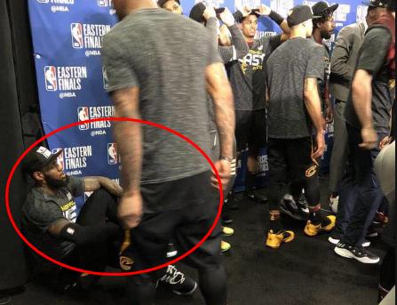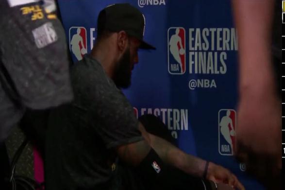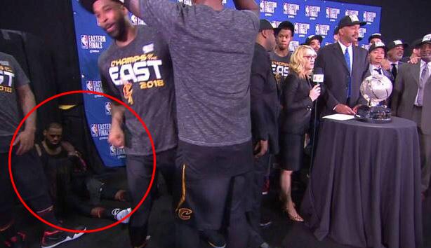 在骑士赛后领取东部冠军的仪式上,詹姆斯却不在欢庆的人群里。原来此时的三旬老汉已经是累到在地,他独自靠在一个角落里,没有多余的精力与队友们欢庆这个来之不易的东部冠军,而是十分疲态需要休息。