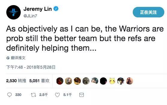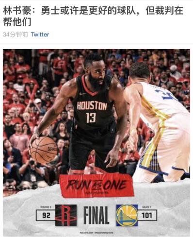 林书豪更是在赛后第一时间,发表了对本场比赛的看法:“勇士虽然实力更甚一筹,但是明显裁判是在帮助勇士。”