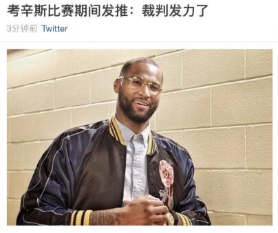 鹈鹕中锋考辛斯,则是直接在比赛期间,就在个人社交媒体上说出了“裁判发力了”的言论。