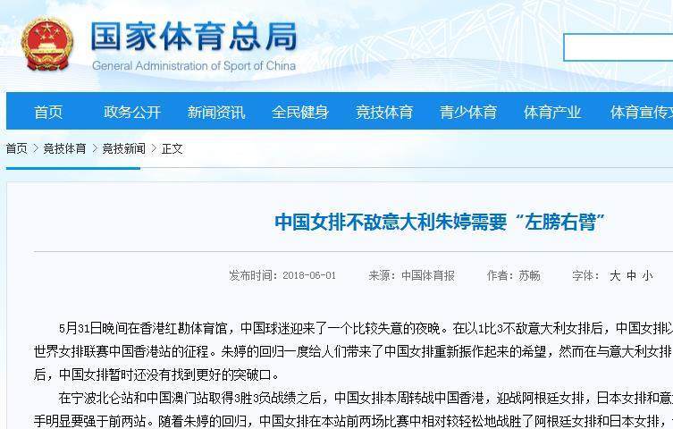 体育总局转载《中国体育报》的相关报道,认为中国女排之所以在朱婷出战的情况下,还丢失冠军,并非是朱婷表现低迷所造成,更多的还是因为朱婷缺少帮助,在女排队长身边缺少“左膀右臂”。